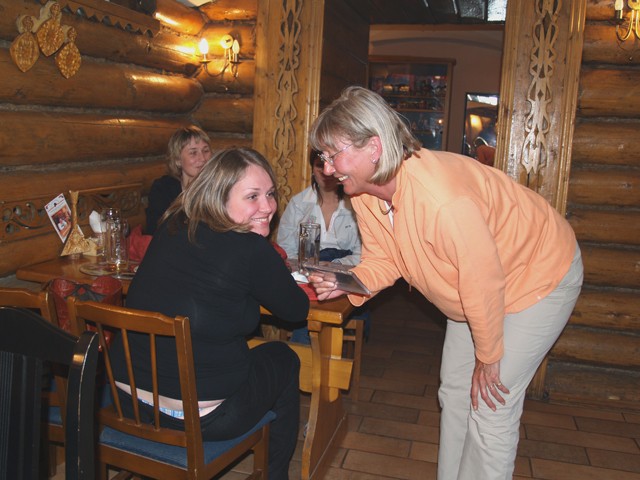 Um 20.00 h, wie verabredet, melden sich unsere Mägen und begehren wieder feste Nahrung. Es werden noch schnell alle laufenden Partien beendet und wir verabschieden uns wieder, zum vierten Male ?, von unseren Freunden. Wo wir hin gehen. Nun wir wollen in dieses Restaurant hier! Marie-Annick zeigt ihren Reiseführer. Sasha, der Große, ruft an und sagt uns dass der Laden geschlossen sei. Also, Plan B, wir gehen in das Kalinka Malinka. Und unsere Freunde, von denen wir uns gerade verabschiedet hatten, gehen zum großen Teil mit.