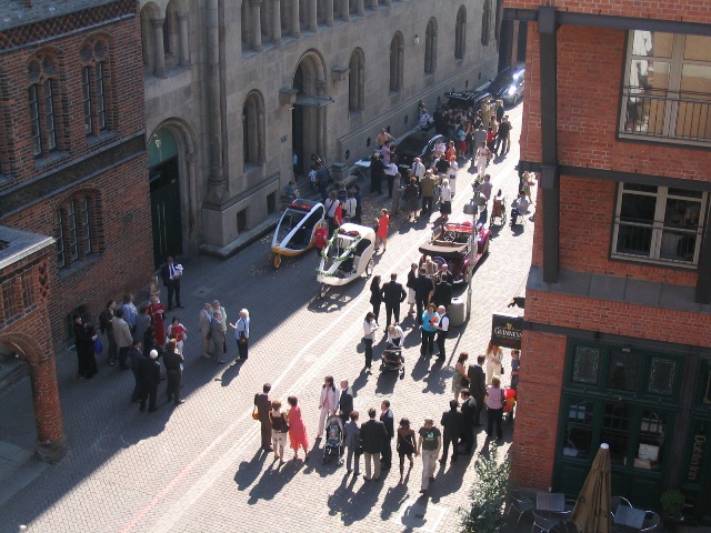 Brautpaare mit ihren Hochzeitsgästen am Nebeneingang des Alten Rathauses