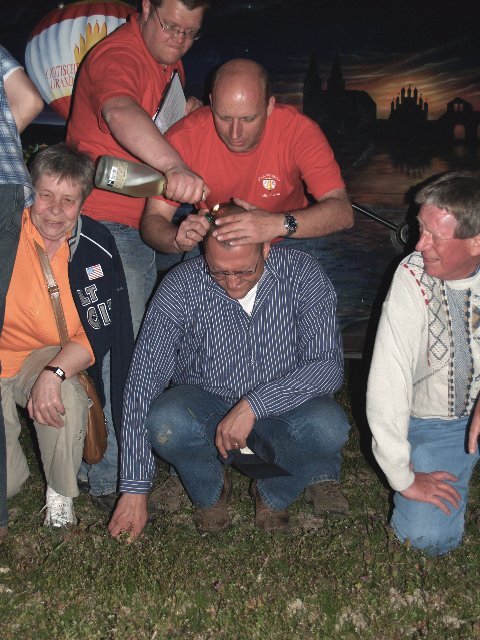 Den Abschluss diese einzigartigen Ereignisses bildete dann die Ballonfahrertaufe. Alle Passagiere, die zum ersten Mal eine Fahrt im Ballon unternommen hatten mussten sich nun einer ehrwürdigen Tradition unterwerfen. Nachdem ein winziges Büschel Haare (bei mir eine außerordentlich schwierige Operation) abgebrannt wurde, löschte Michael den „Brand“ mit Schampus und taufte zusätzlich mit der Erde auf der wir gelandet waren. In einer feierlichen Zeremonie erhielten wir dabei auch unsere Ballonfahrer Namen, die uns urkundlich übermittelt wurden und uns das Lehen des überflogenen Luftraumes in 2 Meter Höhe sichern. Gefeiert wurde diese Eigentumsübereignung mit Schampus und Bier. Angeblich waren wir die erste Reisegesellschaft, die den vorhandenen Vorrat vollkommen geplündert hat.
