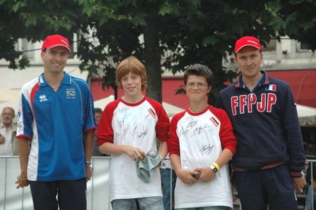 in Maastricht teilzunehmen. Diese Turnierserie wird (wie bei den Profis) in acht verschiedenen französischen Städten ausgetragen. Maastricht war zum ersten Mal als ausländischer Austragungsort ausgewählt worden. Die jeweiligen Sieger werden zum Finale in Südfrankreich eingeladen. Unser Team mit Hanh (9), Christian (13) aus Aachen und Justus (13) aus Bonn, dass bei den NRW-Jugendmeisterschaften vom Landesverband mit neuen NRW-Shirts ausgestattet worden ist, schaute etwas ungläubig und mit großen Augen als sie erfuhren, dass sie auf dem Carré d’Honneur auf dem Vrijthof im Zentrum von Maastricht antreten sollten. Wir wurden als ’Deutsches Team’ sehr freundlich begrüßt, konnten aber auch unsere regionale Zugehörigkeit in einigen Gesprächen mit den Offiziellen und Betreuern der Teams klären. Und dass vorab: Unsere Jugendlichen erfuhren für ihr Auftreten, den freundlichen Umgang mit den Gegnern und ihr konzentriertes Spiel von allen Seiten großes Lob. Unter den Augen der Trainer und Coaches wurde ihnen eine boulelistische Perspektive attestiert. Bei der Einschreibung merkte man schon den Stellenwert dieser Veranstaltung. Ausgestattet mit Backstage-Bändchen, VIP-Status, etc. bescherte uns die Auslosung im B-Poule die vermeidlich stärksten Gegner. Unsere Spieler haben davon natürlich nichts erfahren und konnten somit unbeschwert aufspielen. Das Turnier wurde um Punkt 14 Uhr bei herrlichstem Sommerwetter angepfiffen. In der Poule-Runde wurde jeder-gegen-jeden bei einem Zeitlimit von 40 min gespielt. Anschließend jeweils ein Finalspiel der Gruppengleichplazierten. 1. SpielNRW – Team Jeu de Bommel/Amicale Cuijk (9-10)(0-2, 0-4, 1-4, 1-10, 2-10, 3-10, 4-10, 9-10) Sichtlicht nervös und zumindest Hanh noch etwas verloren auf dem großen Spielfeld wurden die ersten Aufnahmen angegangen. Der erste Punkt in der dritten Aufnahme wurde dann entsprechend von den mitgereisten Fans lautstark von der Tribüne bejubelt. Der Anfang schien gemacht. Jedoch zwei Löcher von Christian und ein sauberes Entfernen der eigenen besten Kugel durch Justus brachten ein deprimierendes Six-Pack zum 1 zu 10. - Teambesprechung. – Die zuvor etwas zu defensive Spielweise wurde in eine offensivere gewandelt. und prompt folgten die Punkte 2,3, und 4 in den nächsten drei Aufnahmen. Dann folgte die beste und im Nachhinein etwas unglückliche Aufnahme unsers Teams: Hanh legt auf 8 Meter eine zwingend zu schießende Kugel. Zwei Löcher und der Gegner bringt nur eine störende Kugel ohne Punkt 50 cm vor die Sau. Diese wird nach kurzer Besprechung durch Christian mit Punkt entfernt. Eine von den nachzulegenden Kugeln bleibt leider hängen. - 5 Punkte , 9 zu 10. Dann beendete das Zeitlimit die grandiose Aufholjagd: Sekunden vor dem Sauwurf zur 9ten Aufnahme wurde abgepfiffen. Fazit: Unser Team hatte sich nach anfänglichem nervösen Beginn auf dem gewöhnungsbedürftigen Terrain (Kies auf Asphalt) gefunden, stark das Mittelspiel gestaltet und am Ende etwas unglücklich gegen den späteren Turniersieger verloren. Das lies hoffen. 2. SpielNRW – Nationale Selectiv des niederländischen Verbandes (NJBB) (12-11)(0-2, 5-2, 6-2, 6-6, 6-11, 10-11, 12-11) Die gerade aus Barcelona zurück gekommenen Kaderspieler des niederländischen Verbandes, die ihre erste Begegnung mit 12 zu 0 gewonnen hatten, begannen stark. Uns (mir und den Mitgereisten) schwante Böses. Sollte diese Partie schon das vorzeitige Aus auf einen Podiumsplatz bedeuten? Unser Team belehrte uns eines Besseren: Schon in der zweiten Aufnahme nutzten sie die Chance, nach zwei Löchern der schussfreudigen Niederländer, mit zwei super nachgelegten Kugeln von Hanh und guter Vorarbeit durch Justus, auf 5 Punkte! Nach unserem 6ten Punkt folgten zwei starke Aufnahmen der Gegner, die mit dem einem und anderen Carreau auf 6-11 davonzogen. Es folgte eine kurze Absprache zwischen den Dreien: Hanh geht wieder in die Legerposition. Abermals zeigten die Jugendlichen starkes Spiel unter Stress. 4 Punkte (10-11) ist der Lohn. Jetzt musste die Sau schnell geworfen werden, denn es drohte wieder das Zeitlimit. Hanh legt nachfolgend zwingend. Die Niederländer lochen und versuchen nach dem Abpfiff eine Mauer aufzubauen. 11-11 und noch fünf Kugeln auf der Hand. Was tun? Kurze Besprechung. Hanh sieht die Lücke und zirkelt den Siegpunkt an die Sau. Die Jungs müssen nicht mehr eingreifen. Großer Jubel bei uns und etwas verdutztes Staunen bei den Auswahlspielern Hollands beendeten diese Partie. Fazit: Ein immer besser harmonisierendes Team erlaubte sich immer mal wieder ein Päckchen, konnte aber kontern und zeigte im Endspiel starke Nerven. Klasse! 3. SpielNRW – Equipe 4 (8-5)(0-1, 0-4, 1-4, 4-4, 5-4, 5-5, 8-5) Durch die Ergebnisse der anderen Begegnungen war vor diesem Spiel noch nichts entschieden. Selbst bei einem knappen Sieg konnte es ’nur’ für Platz 3 reichen. Etwas verunsichert ob der Konstellation lag das gegnerische Team schnell mit 0 zu 4 vorne. Nach kurzer Aufmunterung kämpfte unser Team sich heran. Zweimal musste Justus den vermeidlich vorentscheidenden 5ten Punkt der Gegner entfernen. Jetzt musste einwenig Glück herhalten – der Schiri misst – Punkt bei NRW. – Aufatmen -. In den nächsten zwei Aufnahmen drehen die NRW-Jugendlichen das Spiel. Dann wurde es wieder aufgrund der ablaufenden Zeit wieder spannend. 5-5 liegt und noch 3 Kugeln beim Gegner. Also kurze Info an die Spieler: Schnell die neue Aufnahme beginnen, wenn der 6te Punkt oder mehr kassiert wird.. Es bleibt bei Einem. Abpfiff. In der letzten Aufnahme legt Hanh wieder eine Zauberkugel, die nicht entfernt werden kann. Aber die restlichen Kugeln müssen noch Punkte bringen, oder? Kurze Verwirrung. Unser Team sieht die Gefahr, bringt aber noch 2 Kugeln. 8-5. Damit war dann das Spiel um den dritten Platz gesichert. Fazit: In diesem Spiel war ein Team gewachsen: verlegte oder verschossene Kugeln wurden von dem Team korrigiert. Uns Betreuern hat es ein paar Graue Haare gekostet. 4. Spiel (