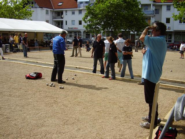 700 Jahre Mechernich. Das ist ein Grund zum feiern. Daher hatte die Stadt den Wunsch geäußert eine Boule-Veranstaltung nach Mechernich zu verlegen. Diesem Wunsch ist der BPV NRW gerne nachgekommen. So stand schon lange vorher fest: Die Meisterschaft Doublette Mixte geht an Mechernich. Und Mechernich hat sich mächtig ins Zeug gelegt. Viele Hände mussten anpacken um aus einem Parkplatz eine bespielbare Bouleanlage zu machen. 80 Tonnen Splitt wurden auf dem Nyonplatz aufgetragen. Zelte für die Verpflegung wurden errichtet. Marktstände mit französischen Waren wurden aufgebaut. Kurzum: Der Aufwand hat sich gelohnt. Am Schluss waren alle zufrieden.