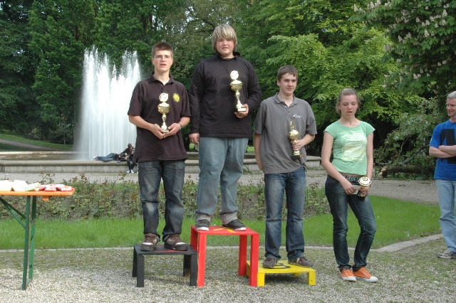 Nun wurden die Erfolge aller Teilnehmerinnen und Teilnehmer bejubelt, die Sieger geehrt und die zahlreichen Pokale verteilt. Jonas Runo vom BC Ennert hatte hierfür eigens sein selbstgebautes Siegertreppchen mitgebracht.
