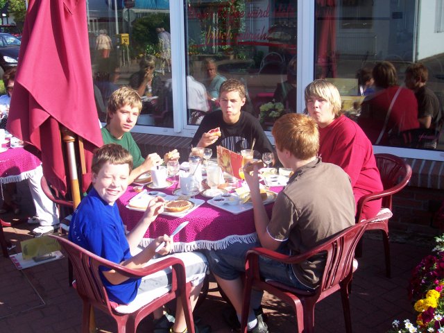 Die Jugendfahrt nach Büsum an die Nordsee war eine schöne Sache. Eigentlich sollte es ja erst am Mittwoch losgehen, aber nach dem Angebot der Familie Vormann, die erste Etappe der Fahrt in Coesfeld enden zu lassen, um erstens ein Turnier zu spielen und zweitens früh aufbrechen zu können, landeten sieben Jugendliche (Jan, Justus, Jonas, Moritz, Helen, Niklas, Julia) schon am Dienstag Abend in Coesfeld und marschierten aus dem weißen „Partybus“ direkt aufs Spielfeld wo Marie und Annika schon auf uns warteten. Wir wurden von allen Coesfeldern freundlich empfangen und hatten nach dem Spielen bis zur Dunkelheit bei Vormanns auch noch eine gute Herberge für die Nacht. Nachdem am nächsten Morgen Markus Vormann und Detlev Runo um 7 Uhr Brötchen geholt hatten, gab es Frühstück. Jonas weckte alle, die nicht so recht aufstehen wollten, mit einem Megafon. So hatten auch die Nachbarn noch etwas davon.