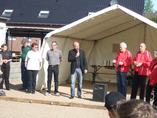 Das Turnier startete pünktlich um 10:15 Uhr am Samstag. Vorausgegangen waren eine Begrüßung durch Raymund Meier, der sich u. a. bei den Organisatoren des Turniers vom örtlichen Bouleverein Noire et Blanche Boule 92 Huchem-Stammeln für die Vorarbeiten und die Bewirtung bedankte, die Bedingungen des Zeitrahmenplans erklärte und uns allen und den Aktiven ein gutes Gelingen wünschte. Auch der Bürgermeister der Gemeinde Niederzier Herr Heuser und die Ortsvorsteherin Frau Hahn sprachen ein Grußwort zu den rund 85 Zuhörern und übergaben dem Organisatorenteam eine kleine Anerkennung in Form eines Spendenumschlages.