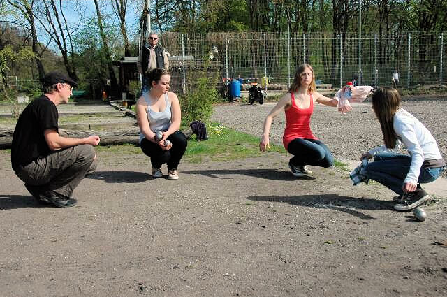 Bild 2: Dirk Beckschulte übt mit Helen, Julia und Lisa Ballett in der Hocke