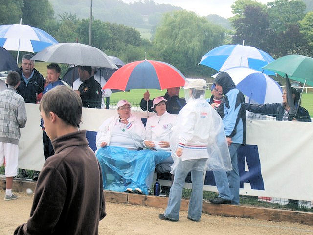 Pünktlich zum Beginn der 7. und letzten Runde, die um 21:20 begann setzte der große Regen ein. Bis dahin hatte das Wetter sich gut gehalten. Die Temperaturen war angenehm und die Wolken hielten ihren Regen noch zurück. Diese Partie wurde dann aber unter Regenschirmen und Plastikverhüllungen geführt. Wo fast alle Akteure auf dem Boulodrome schimpften und versuchten Schutz, vor Wind und Wasser zu suchen, spielten allein die Schwedinnen so unbeeindruckt als wäre allerbestes Sommerwetter angesagt. Unsere Gegnerinnen aus der nordfranzösischen Stadt Thionville ließen auf sich warten. Mit für französische Verhältnisse durchaus noch hinnehmbarer viertelstündiger Verspätung begann dann die Wasserschlacht, die bei Ablauf des Zeitlimits den Sieg mit dem Ergebnis von 9:3 brachte.