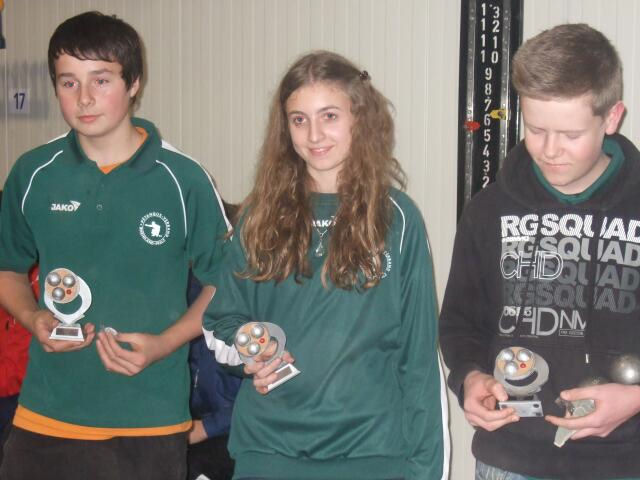 NRW Teams ein starkes Teilnehmerfeld. Gespielt wurden 5 Runden im Schweizer System. In der einen Gruppe traten 9 Juniors Teams und in der anderen Gruppe 8 Cadets Teams und 3 Minimes Teams gegeneinander an. In der Mittagspause wurde von den anwesenden Nachwuchsspielern des BPV ein neuer Jugendsprecher gewählt. Nach ihrer einjährigen Amtszeit wollte Julia Reimers nicht mehr weiter kandidieren. Christian Schneider ist nun der neue Jugendsprecher. Herzlichen Glückwunsch! Um 18:00 Uhr standen die neuen Meister fest. Auch wenn die Minimes in einer Gruppe gegen Cadets spielen mussten, wurde getrennt nach Altersklassen ausgewertet. Die neue Meister sind... bei den Minimes Anna Nguyen, Nicole Leibelt und Marc Hillenberg bei den Cadets, Melissa Bruchmann, Geena Krups und Hendrik Jörges bei den Juniors: André Skiba, Niklas Flocken und Moritz Leibelt Die Minimes haben sich tapfer gegen die älteren Cadets geschlagen und dabei auch für die ein oder andere Überraschung gesorgt. Anna, Nicole und Marc hatten z. B. zwei ihrer drei Siege gegen Cadets erzielt. Bei den Cadets gab es letztendlich 3 Teams, die nach 5 Runden 4 Siege erzielt hatten. Ein Buchholzpunkt weniger als die beiden anderen Teams bescherte dem Gastteam aus Niedersachsen mit Fiedje Reis, Lennart Maier und Mark Oliver Steep eine guten dritten Platz. Den zweiten Platz belegte ein gut aufgelegtes Damenteam mit Jule Klapdor, Hanh Nguyen und Helen Schuldhaus nur deshalb, weil sie im direkten Vergleich dem erstplatzierten Team Melissa, Geena und Hendrik mit 12:13 unterlegen waren. Viele denkbar knappe Ergebnisse zeigen, wie spannend die Begegnungen waren. So mancher Vater erlebte da am Rande des Spielfeldes ungewohnt intensive Gefühlswechselbäder. Viele Partien zeigten zudem auch höchstes Spielniveau. DPV Jugendnationaltrainerin, Gudrun Deterding und der Jugendkaderbeauftragte des BPV NRW, Michael Vierhaus bekamen einiges geboten, was sie für ihre Kadersichtung verwerten konnten. Auch die mitgereisten Landesjugendwarte, Hendryk Wagener für Hessen, Sven Lübbke für Niedersachsen und Eric Barthel für Rheinland Pfalz konnten mit der Leistung ihrer Schützlinge zufrieden sein. Das „Endspiel“ bei den Juniors, bzw. das alles entscheidende Spiel in der 5 Runden gestalteten Niklas, André, Moritz gegen Florian Kalinna, Marcel und Dennis Hoffmann aus Niedersachsen ebenfalls bis zum 13.12 sehr spannend. Damit erzielte das gemischte Team aus NRW und BaWü letztlich 5 Siegen in 5 Runden und war doch deutlicher Sieger vor 5 Teams mit jeweils 3 Siegen. Das Experiment, die Jugend im Triplette bei einer offenen Landesmeisterschaft spielen zu lassen, erscheint angesichts der guten Beteiligung, der guten Resonanz bei den Gästen und den erzielten Erfolgen gelungen. Das Ergebnis macht Mut, bei den Landesmeisterschaften der Jugend im Sommer (Termin: 13.05.2012) in dieser Form weiter zu machen. Der Film, den Norbert Koch freundlicherweise bei der Veranstaltung aufgenommen und schon Montag morgen bei YouTube ins Netz gestellt hat, gibt glaube ich sehr deutlich wieder, wie unsere Jugend bei fairen und konzentrierten Wettkämpfen eine freundschaftliche Atmosphäre entstehen lassen kann.