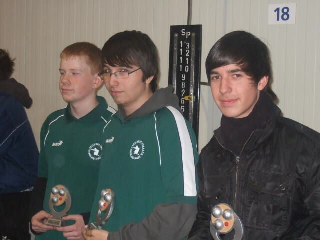 NRW Teams ein starkes Teilnehmerfeld. Gespielt wurden 5 Runden im Schweizer System. In der einen Gruppe traten 9 Juniors Teams und in der anderen Gruppe 8 Cadets Teams und 3 Minimes Teams gegeneinander an. In der Mittagspause wurde von den anwesenden Nachwuchsspielern des BPV ein neuer Jugendsprecher gewählt. Nach ihrer einjährigen Amtszeit wollte Julia Reimers nicht mehr weiter kandidieren. Christian Schneider ist nun der neue Jugendsprecher. Herzlichen Glückwunsch! Um 18:00 Uhr standen die neuen Meister fest. Auch wenn die Minimes in einer Gruppe gegen Cadets spielen mussten, wurde getrennt nach Altersklassen ausgewertet. Die neue Meister sind... bei den Minimes Anna Nguyen, Nicole Leibelt und Marc Hillenberg bei den Cadets, Melissa Bruchmann, Geena Krups und Hendrik Jörges bei den Juniors: André Skiba, Niklas Flocken und Moritz Leibelt Die Minimes haben sich tapfer gegen die älteren Cadets geschlagen und dabei auch für die ein oder andere Überraschung gesorgt. Anna, Nicole und Marc hatten z. B. zwei ihrer drei Siege gegen Cadets erzielt. Bei den Cadets gab es letztendlich 3 Teams, die nach 5 Runden 4 Siege erzielt hatten. Ein Buchholzpunkt weniger als die beiden anderen Teams bescherte dem Gastteam aus Niedersachsen mit Fiedje Reis, Lennart Maier und Mark Oliver Steep eine guten dritten Platz. Den zweiten Platz belegte ein gut aufgelegtes Damenteam mit Jule Klapdor, Hanh Nguyen und Helen Schuldhaus nur deshalb, weil sie im direkten Vergleich dem erstplatzierten Team Melissa, Geena und Hendrik mit 12:13 unterlegen waren. Viele denkbar knappe Ergebnisse zeigen, wie spannend die Begegnungen waren. So mancher Vater erlebte da am Rande des Spielfeldes ungewohnt intensive Gefühlswechselbäder. Viele Partien zeigten zudem auch höchstes Spielniveau. DPV Jugendnationaltrainerin, Gudrun Deterding und der Jugendkaderbeauftragte des BPV NRW, Michael Vierhaus bekamen einiges geboten, was sie für ihre Kadersichtung verwerten konnten. Auch die mitgereisten Landesjugendwarte, Hendryk Wagener für Hessen, Sven Lübbke für Niedersachsen und Eric Barthel für Rheinland Pfalz konnten mit der Leistung ihrer Schützlinge zufrieden sein. Das „Endspiel“ bei den Juniors, bzw. das alles entscheidende Spiel in der 5 Runden gestalteten Niklas, André, Moritz gegen Florian Kalinna, Marcel und Dennis Hoffmann aus Niedersachsen ebenfalls bis zum 13.12 sehr spannend. Damit erzielte das gemischte Team aus NRW und BaWü letztlich 5 Siegen in 5 Runden und war doch deutlicher Sieger vor 5 Teams mit jeweils 3 Siegen. Das Experiment, die Jugend im Triplette bei einer offenen Landesmeisterschaft spielen zu lassen, erscheint angesichts der guten Beteiligung, der guten Resonanz bei den Gästen und den erzielten Erfolgen gelungen. Das Ergebnis macht Mut, bei den Landesmeisterschaften der Jugend im Sommer (Termin: 13.05.2012) in dieser Form weiter zu machen. Der Film, den Norbert Koch freundlicherweise bei der Veranstaltung aufgenommen und schon Montag morgen bei YouTube ins Netz gestellt hat, gibt glaube ich sehr deutlich wieder, wie unsere Jugend bei fairen und konzentrierten Wettkämpfen eine freundschaftliche Atmosphäre entstehen lassen kann.