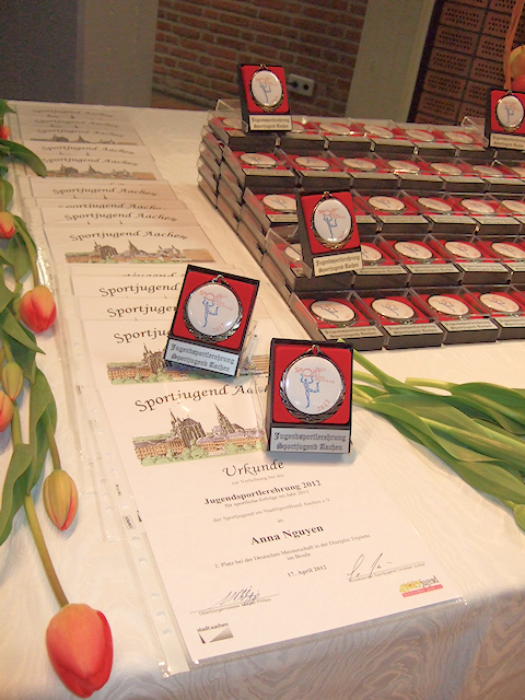 Pétanque-Sport in Aachen, die zweite Anna Nguyen wurde am 17. April 2012 für Ihre Vizemeister-Titel im September 2011 von der Stadt Aachen und der Sportjugend geehrt. Zum zweiten Mal wurde auf der nun zum sechsten Mal stattfindenden Aachener Jugendsportlerehrung die begehrte Medaille entgegen genommen. Zuletzt im April 2010 für den Titel des Deutschen Meisters im Jahre 2009. Der Oberbürgermeister der Stadt Aachen Marcel Phillip war wie Jedes Jahr dabei und übergab Urkunden, Medaillen an die Jungen Sportler/innen. Auch an Lob und Anerkennung wurde nicht gespart. Einen Apfel gab’s der gesunden Ernährung wegen noch dazu, welcher Vorort seiner Bestimmung zugeführt wurde. Insgesamt nahmen 120 junge Sportler und Sportlerinnen verschiedener Sportdisziplinen in drei Ehrungskategorien (Bezirks-, Landes-, Deutscher Meister, bzw. Europa und Welt) an dieser Veranstaltung teil. Der Ablauf wurde von zwei Stimmungsvolle junge Damen (Martina Rippholz und Rica Kouhl) von der Aachener Nachrichten moderiert. Ein Rockband spielte zwischen den Pausen und ein schwungvolles Schowtanzprogramm gab’s noch dazu. Ein besondere Dank geht an Johannes Krotz, Vorstand unserem Verein Boule d'Aix-la-Chapelle, der uns von der Anmeldung bis zum Teilnahme an diese Veranstaltung begleitet hat. Cuong Nguyen |