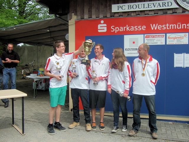 nahezu perfekt ausgerichtetes Turnier. Ich danke allen Beteiligten des PCB Coesfeld für die liebevolle Bewirtung! Gemeinsam mit dem guten Wetter trugen Günter Drees und seine freiwilligen Helfer dazu bei, dass dieses absolut gelungene Wochenende in einer sehr freundschaftlichen Atmosphäre verlief. Und dann gab es da noch einen Schiedsrichter, der für seine unbeugsame Regeltreue bekannt ist, der dieses Turnier sehr einfühlsam begleitet und geführt hat. Danke Raimund! Ein sehr ausgeglichenes Teilnehmerfeld sorgte im Turnier für viele spannende und trotzdem faire Spiele, bei denen es immer wieder überraschende Ergebnisse gab und sich nicht unbedingt vorzeitig klare Favoriten absetzen konnten. Am Ende des Wochenendes stand ein großer Erfolg für die Jugend aus NRW fest. Der 1. Platz für die BPV NRW Junior war natürlich insgeheim erhofft, konnte dennoch nicht als selbstverständlich angenommen werden. Der Weg bis zum Endspiel war auch schwer umkämpft. In der 1. Runde stand unser Team den Niedersachsen gegenüber, die uns beim Länderpokal in Düsseldorf noch eine schmerzliche Niederlage zugefügt hatten. Nach diesem gelungenen „Vorrundenauftaktsieg“ konnten in Runde 2 das Team aus Bayern, der Sieger des Jugendländermasters 2011 sicher geschlagen werden. In den nächsten beiden Runden gab es dann unerfindliche Niederlagen gegen Hessen und Rheinland Pfalz. Die Junioren aus Baden Württemberg waren in der 5. Runde der erwartet unangenehme Gegner. Immerhin konnte dieses wichtige Spiel gegen einen starken Gegner knapp gewonnen werden wohingegen in der letzen Vorrundenbegegnung das Team aus dem Saarland wieder sicher dominiert wurde. Der zwischenzeitliche „Einbruch“ verhinderte somit nicht die Halbfinalteilnahme. So kam es dann wieder zu einem Treffen erst mit den Bayern und anschließend im Finale mit Rheinland Pfalz. Der Vorrundensieg gegen Bayern konnte bestätigt werden. Gegen das Team aus RPf spielte NRW im Finale konzentrierter. Der Turniersieg war mit 13:7 gelungen. Natürlich möchte ich deshalb an erster Stelle den Akteuren gratulieren! Annika Vormann,