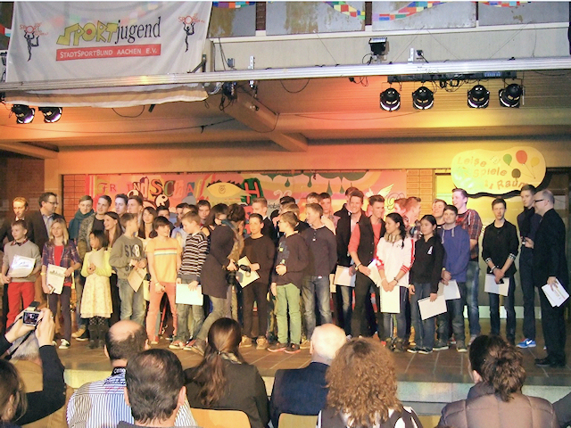 Pétanque-Sport in Aachen, die dritte Anna Nguyen (Minimes) und Hanh Nguyen (Cadets) wurden am 19. März 2013 für Ihren Landesmeister-Titel 2012 von der Stadt Aachen und der Sportjugend geehrt. Zum dritten Mal wurde auf der nun zum siebten Mal stattfindenden Aachener Jugendsportlerehrung die begehrte Medaille entgegen genommen (zuletzt im April 2012 für den Titel des Deutschen Vizemeisters im Jahre 2011). Der Oberbürgermeister der Stadt Aachen Marcel Phillip war wie jedes Jahr unter den Ehrengästen um die Jugendlichen mit Urkunden und Medaillen zu ehren. (aha!, daher der Begriff „Ehrengast...“). Insgesamt waren auf der diesjährigen Jugendsportlerehrung der Stadtsportjugend Aachen 136 jugendliche Sportler von verschiedenen Sportdisziplinen in drei Ehrungskategorien (Bezirks-, Landes-, und Deutscher Meister) geehrt worden. Cuong Nguyen |