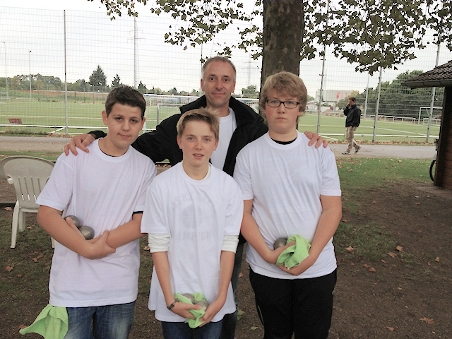 Deutschen Jugendmeisterschaft in Mannheim-Käfertal Erfolgreiches Wochenende für die NRW-Jugend Deutscher Juniorenmeister Julia Reimers - Carl Rost - Lasse Stentenbach 3. Platz Minimes Joana Odenwälder - Finja Rieks - Jonas Madai Zur diesjährigen Jugend-DM fuhren wir mit insgesamt 10 Teams aus NRW. Wir trafen uns Freitag um 14.00 Uhr in Ratingen-Lintorf zur gemeinsamen Anreise mit 4 Kleinbussen und sammelten in Köln noch einige Mitspieler ein, ehe wir nach Mannheim durchstarten konnten. Um 18:30 waren wir endlich am Hotel. Wir beeilten uns, die Zimmer zu belegen, da wir noch eine Platzbesichtigung vornehmen wollten. Die Bouleanlage des SC Käfertal war riesig, die Plätze leicht sandig und gut bespielbar. Unsere Jugendlichen haben am gleichen Abend noch eine Trainingseinheit eingelegt und waren allgemein recht zufrieden mit den Platzverhältnissen. Die Organisation des SC Käfertal war bombastisch. Viele fleißige Helfer boten bereits am Freitag eine Vielzahl an Speisen und Getränken. Das Angebot war so vielfältig (Flammkuchen, Pizza, Steaks, Nudeln, Geschnetzeltes, Currywurst, Pommes …..), dass die Kinder meist nicht wussten, was sie nehmen sollten. Insgesamt eine tolle DM durch den SC Käfertal. Vielen Dank seitens des BPV NRW !!!! Zurück im Hotel setzten wir uns im Betreuerstab zusammen und berieten noch über Teamzusammensetzungen und Teambetreuungen Am nächsten Morgen und einem ausgiebigen Frühstück in einer Bäckerei fuhren wir bereits gegen 7:30 zum Platz, da die Einschreibung um 7:45 Uhr begann. Leider fing es bereits bei der Einschreibung an zu regnen und hörte an diesem Tag auch nicht mehr auf. Auf dem sandigen Gelände bildeten sich schnell matschige Stellen; im Laufe des Tages wurde es so schwierig, dass die meisten Kugeln dort liegen blieben, wo sie aufkamen. Viele Plätze ähnelten eher einer Wildschweinsuhle. Hauptsache die Jugendlichen hatten Spaß !!! Alle passten sich ohne zu murren den widrigen Wetterverhältnissen an und boten gute Leistungen. Zum Spielgeschehen Es wurde im „Schweizer System“ mit 60 Minuten Zeitlimit in der Vorrunde gespielt. Juniors (25 Mannschaften) und Cadets (24 Mannschaften) 5 Runden, die Minimes (12 Mannschaften) 4 Runden. Ergebnisse Vorrunde Juniors NRW 1 (Lasse Stentenbach, Carl Rost und Julia Reimers) Bilanz: 4 Siege und 1 Niederlage, als 4. platzierter das Viertelfinale der DM erreicht NRW 2 (Kerstin Lisner, Francesco Daniele und Helen Schuldhaus) Bilanz: 2 Siege und 3 Niederlagen, B-Turnier erreicht NRW 3 (Hanh Nguyen, Felix Rösner und Ales Matheis) Bilanz: 1 Sieg und 4 Niederlagen, B-Turnier erreicht NRW 4 (Nich Richter, Rene Vennes und William) Bilanz: 2 Siege und 3 Niederlagen, B-Turnier erreicht NRW 5 (mit Jessica Böhmer leider fielen ihre Spielpartner kurz vor der DM aus, so dass sie mit 2 Spielerinnen aus den anderen Fachverbänden spielen musste) Bilanz: 1 Sieg und 4 Niederlagen, B-Turnier erreicht Ergebnisse Vorrunde Cadets NRW 1 (Nicole Leibelt, Timor Bohn und Jan-Luca Odenwälder) Bilanz: 2 Siege und 3 Niederlagen, B-Turnier erreicht NRW 2 (Anna Nguyen, Lisa Klapdor und Denise Reimers) Bilanz: 2 Siege und 3 Niederlagen, B-Turnier erreicht NRW 3 (Melissa Bruchmann, Marvin Dünnwald und Lucas Durst) Bilanz: 0 Siege und 5 Niederlagen, B-Turnier erreicht NRW 4 (Jonas Flüß, Andre Thissen und Philipp Krönert) Bilanz: 3 Siege und 2 Niederlagen, B-Turnier erreicht Ergebnisse Vorrunde Minimes NRW 1 (Joana Odenwälder, Finja Rieks und Jonas Madai) Bilanz: 3 Siege 1 Niederlage; als 2. platzierter Viertelfinale DM erreicht. Lasse nahm noch am Tireurwettbewerb teil und schloss die Vorrunde mit 32 Punkten als Bester ab. Halbfinale erreicht. Das sollte die höchste Punktezahl an diesem Wochenende bleiben !!! Glückwunsch !!! Am Sonntag ging es mit den Achtelfinals im B-Turnier zunächst weiter: Bei den Juniors erreichten NRW 2 mit Sieg gegen BaWü 2 und bei den Cadets NRW 2 mit Sieg gegen NiSa 2 das Viertelfinale. Die anderen Teams verloren leider oft mit knappen Ergebnissen. Pünktlich zu den Viertelfinals ließ der Regen nach. Die Plätze waren so aufgeweicht, dass sie nicht mehr bespielbar waren. Die fleißigen Helfer des SC Käfertal hatten in den frühen Morgenstunden bereits die Gehwege um das Fußballstadion präpariert, so dass dort weitergespielt wurde. Die Verhältnisse konnten als fair und schwierig bezeichnet werden. Über Betonboden wurde eine leichte Kiesschicht gelegt. Viertelfinale Im A-Turnier musste NRW 1 direkt gegen NiSa 1 ran, die ihnen am Vortag die einzige Niederlage beigebracht hatten. Diesmal kam die Revanche; und wie beim Stande von 8:10 beendeten unsere Junioren die Partie mit einem Fünfer !!! Ebenfalls im A-Turnier mussten unsere Minimes gegen Hessen 2 ran. Mit einem tollen Spiel besiegten sie Hessen 2 mit 13:8 !!!!! Hierbei muss gesagt werden, dass alle drei Spieler/innen erst seit einigen Monaten dem Boulesport nachgehen. Im B-Turnier bezwang unser Junior Team NRW 2 das Team von Rhpfl 1 wie in der Vorrunde mit 13:9 Ebenfalls im B-Turnier unterlag das Cadet Team NRW 2 gegen NiSa 1 mit 7:11 Halbfinale Im A-Turnier spielte unser Junior Team NRW 1 gegen den Topfavoriten aus BaWü 1, dem DPV Kaderteam 2 der 3 Spieler haben gerade erst für Deutschland die WM gespielt. Mit einer wirklich sehr guten Leistung und einem tollen Teamspirit wurde das Topteam aus BaWü mit 13:8 besiegt. Sie hatten nie die Chance, ins Spiel zu kommen. Im A-Turnier der Minimes spielte NRW 1 ebenfalls gegen das Topteam BaWü 1 und unterlag in einer äußerst spannend geführten Partie unglücklich mit 10:13. 3. Platz erreicht !!! Auch, wenn die Mannschaft etwas traurig war, ist es ein toller Erfolg für unsere Jüngsten. Im B-Turnier waren unsere Juniors NRW 2 leider Chancenlos und unterlagen Bayern 1 mit 3:13. 3.Platz im B-Turnier erreicht. !!! Glückwunsch !!! Lasse musste noch das Halbfinale im Tireurwettbewerb gegen Lucia Beil, einer Nationalspielerin aus Bayern, bestreiten und unterlag mit 18:23. Toller 3. Platz für Las