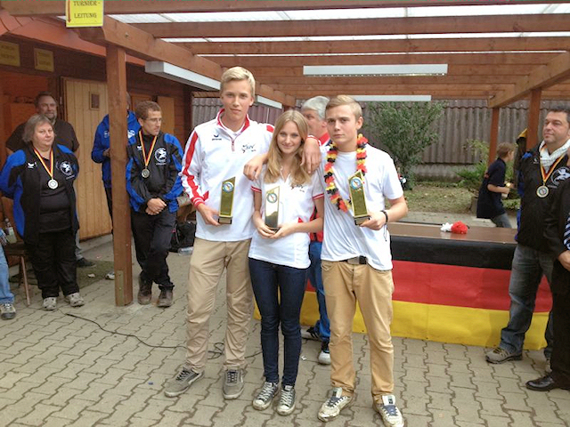 Deutschen Jugendmeisterschaft in Mannheim-Käfertal Erfolgreiches Wochenende für die NRW-Jugend Deutscher Juniorenmeister Julia Reimers - Carl Rost - Lasse Stentenbach 3. Platz Minimes Joana Odenwälder - Finja Rieks - Jonas Madai Zur diesjährigen Jugend-DM fuhren wir mit insgesamt 10 Teams aus NRW. Wir trafen uns Freitag um 14.00 Uhr in Ratingen-Lintorf zur gemeinsamen Anreise mit 4 Kleinbussen und sammelten in Köln noch einige Mitspieler ein, ehe wir nach Mannheim durchstarten konnten. Um 18:30 waren wir endlich am Hotel. Wir beeilten uns, die Zimmer zu belegen, da wir noch eine Platzbesichtigung vornehmen wollten. Die Bouleanlage des SC Käfertal war riesig, die Plätze leicht sandig und gut bespielbar. Unsere Jugendlichen haben am gleichen Abend noch eine Trainingseinheit eingelegt und waren allgemein recht zufrieden mit den Platzverhältnissen. Die Organisation des SC Käfertal war bombastisch. Viele fleißige Helfer boten bereits am Freitag eine Vielzahl an Speisen und Getränken. Das Angebot war so vielfältig (Flammkuchen, Pizza, Steaks, Nudeln, Geschnetzeltes, Currywurst, Pommes …..), dass die Kinder meist nicht wussten, was sie nehmen sollten. Insgesamt eine tolle DM durch den SC Käfertal. Vielen Dank seitens des BPV NRW !!!! Zurück im Hotel setzten wir uns im Betreuerstab zusammen und berieten noch über Teamzusammensetzungen und Teambetreuungen Am nächsten Morgen und einem ausgiebigen Frühstück in einer Bäckerei fuhren wir bereits gegen 7:30 zum Platz, da die Einschreibung um 7:45 Uhr begann. Leider fing es bereits bei der Einschreibung an zu regnen und hörte an diesem Tag auch nicht mehr auf. Auf dem sandigen Gelände bildeten sich schnell matschige Stellen; im Laufe des Tages wurde es so schwierig, dass die meisten Kugeln dort liegen blieben, wo sie aufkamen. Viele Plätze ähnelten eher einer Wildschweinsuhle. Hauptsache die Jugendlichen hatten Spaß !!! Alle passten sich ohne zu murren den widrigen Wetterverhältnissen an und boten gute Leistungen. Zum Spielgeschehen Es wurde im „Schweizer System“ mit 60 Minuten Zeitlimit in der Vorrunde gespielt. Juniors (25 Mannschaften) und Cadets (24 Mannschaften) 5 Runden, die Minimes (12 Mannschaften) 4 Runden. Ergebnisse Vorrunde Juniors NRW 1 (Lasse Stentenbach, Carl Rost und Julia Reimers) Bilanz: 4 Siege und 1 Niederlage, als 4. platzierter das Viertelfinale der DM erreicht NRW 2 (Kerstin Lisner, Francesco Daniele und Helen Schuldhaus) Bilanz: 2 Siege und 3 Niederlagen, B-Turnier erreicht NRW 3 (Hanh Nguyen, Felix Rösner und Ales Matheis) Bilanz: 1 Sieg und 4 Niederlagen, B-Turnier erreicht NRW 4 (Nich Richter, Rene Vennes und William) Bilanz: 2 Siege und 3 Niederlagen, B-Turnier erreicht NRW 5 (mit Jessica Böhmer leider fielen ihre Spielpartner kurz vor der DM aus, so dass sie mit 2 Spielerinnen aus den anderen Fachverbänden spielen musste) Bilanz: 1 Sieg und 4 Niederlagen, B-Turnier erreicht Ergebnisse Vorrunde Cadets NRW 1 (Nicole Leibelt, Timor Bohn und Jan-Luca Odenwälder) Bilanz: 2 Siege und 3 Niederlagen, B-Turnier erreicht NRW 2 (Anna Nguyen, Lisa Klapdor und Denise Reimers) Bilanz: 2 Siege und 3 Niederlagen, B-Turnier erreicht NRW 3 (Melissa Bruchmann, Marvin Dünnwald und Lucas Durst) Bilanz: 0 Siege und 5 Niederlagen, B-Turnier erreicht NRW 4 (Jonas Flüß, Andre Thissen und Philipp Krönert) Bilanz: 3 Siege und 2 Niederlagen, B-Turnier erreicht Ergebnisse Vorrunde Minimes NRW 1 (Joana Odenwälder, Finja Rieks und Jonas Madai) Bilanz: 3 Siege 1 Niederlage; als 2. platzierter Viertelfinale DM erreicht. Lasse nahm noch am Tireurwettbewerb teil und schloss die Vorrunde mit 32 Punkten als Bester ab. Halbfinale erreicht. Das sollte die höchste Punktezahl an diesem Wochenende bleiben !!! Glückwunsch !!! Am Sonntag ging es mit den Achtelfinals im B-Turnier zunächst weiter: Bei den Juniors erreichten NRW 2 mit Sieg gegen BaWü 2 und bei den Cadets NRW 2 mit Sieg gegen NiSa 2 das Viertelfinale. Die anderen Teams verloren leider oft mit knappen Ergebnissen. Pünktlich zu den Viertelfinals ließ der Regen nach. Die Plätze waren so aufgeweicht, dass sie nicht mehr bespielbar waren. Die fleißigen Helfer des SC Käfertal hatten in den frühen Morgenstunden bereits die Gehwege um das Fußballstadion präpariert, so dass dort weitergespielt wurde. Die Verhältnisse konnten als fair und schwierig bezeichnet werden. Über Betonboden wurde eine leichte Kiesschicht gelegt. Viertelfinale Im A-Turnier musste NRW 1 direkt gegen NiSa 1 ran, die ihnen am Vortag die einzige Niederlage beigebracht hatten. Diesmal kam die Revanche; und wie beim Stande von 8:10 beendeten unsere Junioren die Partie mit einem Fünfer !!! Ebenfalls im A-Turnier mussten unsere Minimes gegen Hessen 2 ran. Mit einem tollen Spiel besiegten sie Hessen 2 mit 13:8 !!!!! Hierbei muss gesagt werden, dass alle drei Spieler/innen erst seit einigen Monaten dem Boulesport nachgehen. Im B-Turnier bezwang unser Junior Team NRW 2 das Team von Rhpfl 1 wie in der Vorrunde mit 13:9 Ebenfalls im B-Turnier unterlag das Cadet Team NRW 2 gegen NiSa 1 mit 7:11 Halbfinale Im A-Turnier spielte unser Junior Team NRW 1 gegen den Topfavoriten aus BaWü 1, dem DPV Kaderteam 2 der 3 Spieler haben gerade erst für Deutschland die WM gespielt. Mit einer wirklich sehr guten Leistung und einem tollen Teamspirit wurde das Topteam aus BaWü mit 13:8 besiegt. Sie hatten nie die Chance, ins Spiel zu kommen. Im A-Turnier der Minimes spielte NRW 1 ebenfalls gegen das Topteam BaWü 1 und unterlag in einer äußerst spannend geführten Partie unglücklich mit 10:13. 3. Platz erreicht !!! Auch, wenn die Mannschaft etwas traurig war, ist es ein toller Erfolg für unsere Jüngsten. Im B-Turnier waren unsere Juniors NRW 2 leider Chancenlos und unterlagen Bayern 1 mit 3:13. 3.Platz im B-Turnier erreicht. !!! Glückwunsch !!! Lasse musste noch das Halbfinale im Tireurwettbewerb gegen Lucia Beil, einer Nationalspielerin aus Bayern, bestreiten und unterlag mit 18:23. Toller 3. Platz für Las