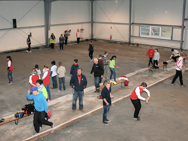 Gelungene Jugend-Landesmeisterschaft in der Halle Organisiert wurde die 2. offene LM der Jugend in der Düsseldorfer Boulehalle vom Jugend-Ausschuss NRW um den neuen kommissarischen Jugendwart Uwe Zipter, Sandra Schneider, Andreas Menzen (komm.) und Martin Wleklik. Die Verlegung vom sonntäglichen Feiertag auf den Samstag hatte einen äußerst positiven Nebeneffekt auf die Teilnehmerzahl. Insgesamt gingen 45 Kinder und Jugendliche aus rekordverdächtigen sechs Landesverbänden an den Start. Die befreundeten Verbände aus Niedersachsen und Hessen schickten eine bzw. fünf (!) komplette Mannschaften in den Wettbewerb. Die nordrhein-westfälischen SpielerInnen equipierten sich darüber hinaus auch mit Teilnehmern aus Baden-Württemberg, Bayern und Rheinland-Pfalz. Nach der Begrüßung durch Uwe Zipter begann das Turnier für die acht Juniors- und sieben Cadets-Triplettes, darunter ein reines Minimes-Team von dem später noch die Rede sein wird, mit vier Vorrundenspielen nach Schweizer System. Nach vielen spannenden Partien ergaben sich bei den Cadets und Juniors folgende Ranglisten: