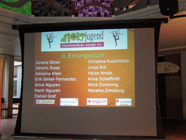 Pétanque-Sport in Aachen, die vierte Bei der 8. Jugendsportlerehrung der Stadt Aachen am 8. April 2014 wurden Anna und Hanh Nguyen für ihre sportlichen Leistungen im vergangenen Jahr von der Stadt Aachen und der Sportjugend geehrt. Anna: 2. Platz Landesmeisterschaft in der Halle (Cadets) Hanh: 1. Platz Offene Landesmeisterschaft (Juniors) Mittlerweile schon zum vierten Mal dabei, kennen die Veranstalter und manch Ehrengast die beiden Mädels schon recht gut, bezeichnen die Mädels beim Empfang gar als Stammgäste. Moderator Holger Richter von der Aachener Nachrichten hat in den Jahren endlich gelernt wie man "Nguyen" richtig ausspricht und war darauf ganz Stolz. Der Oberbürgermeister der Stadt Aachen Marcel Philipp war wie jedes Jahr Ehrengast, und durfte nach seiner Ansprache den Kids die Urkunde und Medaille überreichen. Insgesamt wurden 150 Jugendliche in diesem Jahr geehrt. Gewürdigt werden dabei gute und sehr gute Leistungen der jugendlichen Sportlerinnen und Sportler. Die Medaillienjagd geht weiter. Cuong Nguyen |