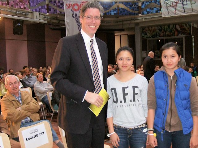 Pétanque-Sport in Aachen, die vierte Bei der 8. Jugendsportlerehrung der Stadt Aachen am 8. April 2014 wurden Anna und Hanh Nguyen für ihre sportlichen Leistungen im vergangenen Jahr von der Stadt Aachen und der Sportjugend geehrt. Anna: 2. Platz Landesmeisterschaft in der Halle (Cadets) Hanh: 1. Platz Offene Landesmeisterschaft (Juniors) Mittlerweile schon zum vierten Mal dabei, kennen die Veranstalter und manch Ehrengast die beiden Mädels schon recht gut, bezeichnen die Mädels beim Empfang gar als Stammgäste. Moderator Holger Richter von der Aachener Nachrichten hat in den Jahren endlich gelernt wie man "Nguyen" richtig ausspricht und war darauf ganz Stolz. Der Oberbürgermeister der Stadt Aachen Marcel Philipp war wie jedes Jahr Ehrengast, und durfte nach seiner Ansprache den Kids die Urkunde und Medaille überreichen. Insgesamt wurden 150 Jugendliche in diesem Jahr geehrt. Gewürdigt werden dabei gute und sehr gute Leistungen der jugendlichen Sportlerinnen und Sportler. Die Medaillienjagd geht weiter. Cuong Nguyen |