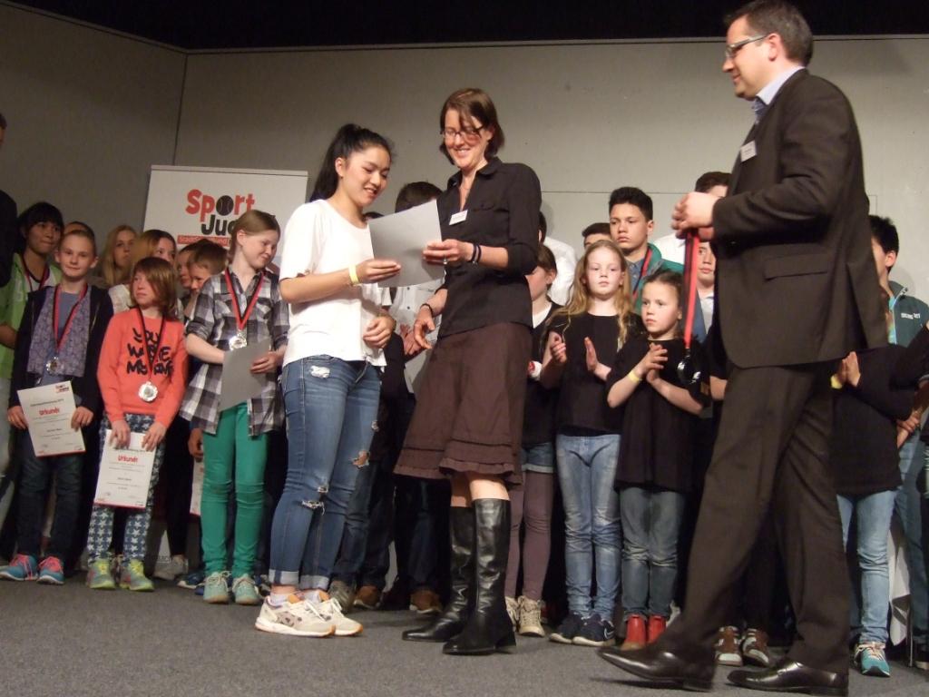 Pétanque-Sport in Aachen, die fünfte Finja Eiken (NRW-Meisterin Minimes), Anna (3. Platz Cadets) und Hanh Nguyen (3. Platz Juniors) wurden Bei der 9. Jugendsportlerehrung am 7. Mai 2015 für ihre sportlichen Leistungen im vergangenen Jahr von der Stadt Aachen und der Sportjugend geehrt. Als der Festsaal mit gut 600 Gästen gefüllt war, wurde spontan und fröhlich ein Geburtstagsständchen angestimmt. Wer hatte wohl Geburtstag? ... Oberbürgermeister Marcel Philipp lässt es sich nicht nehmen, auch an seinem Geburtstag, Urkunden und Medaillen an die Jugendlichen zu verteilen. Frau Daniela Dreymüller, 1. Vorsitzende Sportjugend Aachen, begann mit der Eröffnungsrede. Die Ehrungen der 193 jungen Sportler und Sportlerinnen verschiedener Sportdisziplinen wurden dann vom Oberbürgermeister Marcel Philipp sowie dem 1. Vorsitzenden des Stadtsportbundes Aachen, Björn Jansen, durchgeführt. Zum Abschluss der Veranstaltung gab es eine schwungvolle Tanzshow der Hip-Hop Gruppe RAEVOLUTION, in der Hanh Nguyen zufälligerweise auch tanzt! Cuong Nguyen |