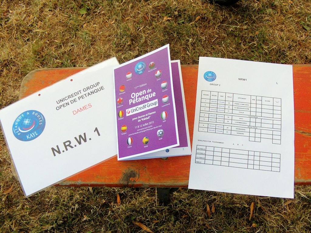et Dames in Kayl, Luxemburg am 11. und 12. Juli 2015 NRW war unter der Leitung des Jugendwartes Uwe Zipter mit drei Teams beim Open de Pétanque pour Jeunes et Dames in Kayl, Luxemburg am Start NRW 1: Denise Reimers, Nicole Leibelt und Dala Lichte, Coach Dirk Beckschulte NRW 2: Helen Schuldhaus, Annika Vormann und Ann-Christin Euler, Coach Simone Goßling NRW Jugend: Silvana Lichte, Anna Nguyen und Jasper Schlüpen, Coach Martin Wleklik Am Freitag starten alle gegen 14:30 Uhr in Köln. Direkt nach der Ankunft in Kayl am frühen Abend ging es – nach Einkauf diverser Wasservorräte (Sommerwetter war angesagt!) - natürlich direkt zum Platz. Nach der Begrüßung des einen und anderen Bekannten machten sich unsere Teams mit den verschiedenen Turnierbahnen vertraut Am Samstag standen 7 Partien bei Sonne und sommerlichen Temperaturen bis 30 °C auf dem Plan! 10 Uhr war Anpfiff der ersten Partie. Das Zeitlimit von 60 Minuten und eine sehr gut organisierte Turnierleitung ermöglichte ein reibungsloses Spielen auf spannenden Böden, so dass die 7. Partie für den Tag für unsere Teams tatsächlich um 21:00 Uhr beendet war. Am Sonntag folgten die Finalspiele. Das internationale Teilnehmerfeld: mit dabei neben Luxemburg, Belgien, Niederlande und Frankreich, auch England, Israel und Italien forderten unsere drei NRW-Teams. Deutschland war neben unseren NRW Damen- und Jugendteams ebenfalls vertreten durch Teams aus dem Saarland, Hessen und Rheinlandpfalz sowie Teams des DPV. Obwohl Denise Reimers, Nicole Leibelt und Dala Lichte – NRW 1-Damenteam Am zweiten Tag mussten sich die drei Damen im 16´tel Finale gegen das Team von Franc-Comtoise geschlagen geben. Jedoch bewahrten sich alle drei die gute Stimmung! Mit der Bilanz von 3:4 Siegen war für unser NRW 2-Damenteam Nach einem Traumstart im ¼ Finale – in zwei Aufnahmen machen sie 7 Punkte – holte das Team aus Südbaden bis 7:12 auf! Unser Team kämpfte weiter, errang weitere 4 Punkte, musste sich jedoch dann mit 11:13 geschlagen geben. Das ambitionierte noch sehr junge NRW-Jugendteam Das Freilos in der3. Runde wurde genutzt das Team neu auszurichten. Danach erkämpfte das Team noch weitere 3 Siege und hatte sich somit mit der Tagesbilanz 5:2 Siege für das B-Turnier qualifiziert. Insgesamt konnte die Mannschaft überzeugen, zeigte technische und taktische Fähigkeiten gepaart mit viel Spielfreude. Am Sonntagmorgen hieß der Gegner im 1/4 Finale Saarland 2. In einer von beiden Mannschaften intensiv geführten Partie mit anfangs wechselnder Führung, konnte mit zwei ganz starken Aufnahmen am Ende 13:8 gewonnen werden. Im Halbfinale erwies sich die schießwütige Jugend-Auswahl der Provinz Lüttich Nach zwei intensiven Turniertagen wurde bei der Siegerehrung Nach der Siegerehrung am Sonntagnachmittag machten sich alle nach einen kurzen abendlichen Stärkung mit Pommes & Co auf dem Heimweg, so dass– trotz einen noch aufgetretenen Autopanne – alle wohlbehalten in der Nacht zu Hause ankamen. Fazit: Ein rundum schönes und erfahrungsreiches internationales Pétanquewochenende! Die NRW-Teams haben sich kämpferisch präsentiert und konnten bei der starken internationalen Besetzung gut mithalten. NRW kann sich bereits jetzt auf die weiteren Entwicklungen unsere jugendlichen Spieler freuen! Simone Goßling Jugendausschuss BPV NRW |