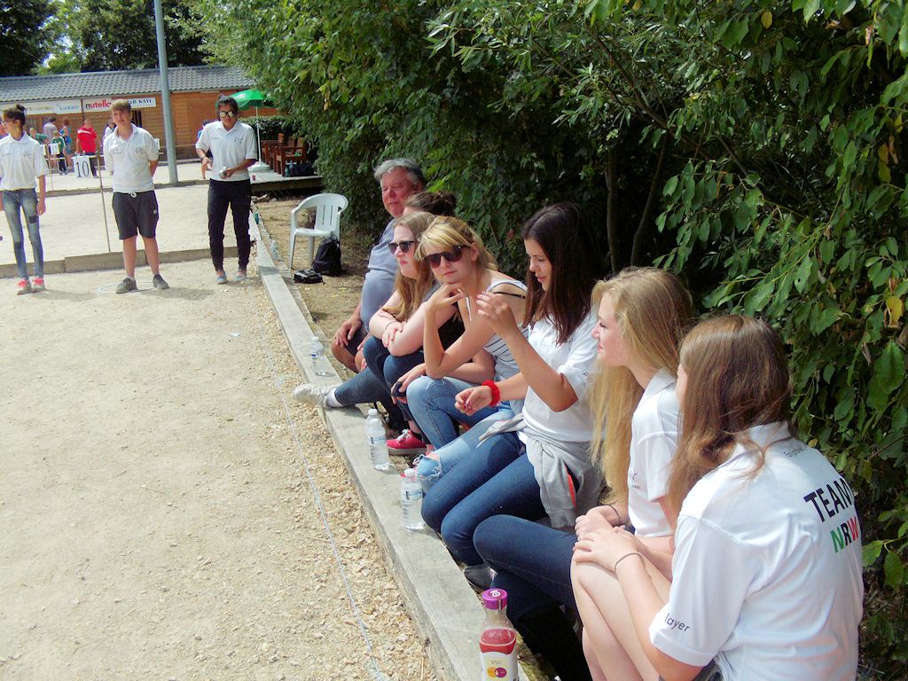 et Dames in Kayl, Luxemburg am 11. und 12. Juli 2015 NRW war unter der Leitung des Jugendwartes Uwe Zipter mit drei Teams beim Open de Pétanque pour Jeunes et Dames in Kayl, Luxemburg am Start NRW 1: Denise Reimers, Nicole Leibelt und Dala Lichte, Coach Dirk Beckschulte NRW 2: Helen Schuldhaus, Annika Vormann und Ann-Christin Euler, Coach Simone Goßling NRW Jugend: Silvana Lichte, Anna Nguyen und Jasper Schlüpen, Coach Martin Wleklik Am Freitag starten alle gegen 14:30 Uhr in Köln. Direkt nach der Ankunft in Kayl am frühen Abend ging es – nach Einkauf diverser Wasservorräte (Sommerwetter war angesagt!) - natürlich direkt zum Platz. Nach der Begrüßung des einen und anderen Bekannten machten sich unsere Teams mit den verschiedenen Turnierbahnen vertraut Am Samstag standen 7 Partien bei Sonne und sommerlichen Temperaturen bis 30 °C auf dem Plan! 10 Uhr war Anpfiff der ersten Partie. Das Zeitlimit von 60 Minuten und eine sehr gut organisierte Turnierleitung ermöglichte ein reibungsloses Spielen auf spannenden Böden, so dass die 7. Partie für den Tag für unsere Teams tatsächlich um 21:00 Uhr beendet war. Am Sonntag folgten die Finalspiele. Das internationale Teilnehmerfeld: mit dabei neben Luxemburg, Belgien, Niederlande und Frankreich, auch England, Israel und Italien forderten unsere drei NRW-Teams. Deutschland war neben unseren NRW Damen- und Jugendteams ebenfalls vertreten durch Teams aus dem Saarland, Hessen und Rheinlandpfalz sowie Teams des DPV. Obwohl Denise Reimers, Nicole Leibelt und Dala Lichte – NRW 1-Damenteam Am zweiten Tag mussten sich die drei Damen im 16´tel Finale gegen das Team von Franc-Comtoise geschlagen geben. Jedoch bewahrten sich alle drei die gute Stimmung! Mit der Bilanz von 3:4 Siegen war für unser NRW 2-Damenteam Nach einem Traumstart im ¼ Finale – in zwei Aufnahmen machen sie 7 Punkte – holte das Team aus Südbaden bis 7:12 auf! Unser Team kämpfte weiter, errang weitere 4 Punkte, musste sich jedoch dann mit 11:13 geschlagen geben. Das ambitionierte noch sehr junge NRW-Jugendteam Das Freilos in der3. Runde wurde genutzt das Team neu auszurichten. Danach erkämpfte das Team noch weitere 3 Siege und hatte sich somit mit der Tagesbilanz 5:2 Siege für das B-Turnier qualifiziert. Insgesamt konnte die Mannschaft überzeugen, zeigte technische und taktische Fähigkeiten gepaart mit viel Spielfreude. Am Sonntagmorgen hieß der Gegner im 1/4 Finale Saarland 2. In einer von beiden Mannschaften intensiv geführten Partie mit anfangs wechselnder Führung, konnte mit zwei ganz starken Aufnahmen am Ende 13:8 gewonnen werden. Im Halbfinale erwies sich die schießwütige Jugend-Auswahl der Provinz Lüttich Nach zwei intensiven Turniertagen wurde bei der Siegerehrung Nach der Siegerehrung am Sonntagnachmittag machten sich alle nach einen kurzen abendlichen Stärkung mit Pommes & Co auf dem Heimweg, so dass– trotz einen noch aufgetretenen Autopanne – alle wohlbehalten in der Nacht zu Hause ankamen. Fazit: Ein rundum schönes und erfahrungsreiches internationales Pétanquewochenende! Die NRW-Teams haben sich kämpferisch präsentiert und konnten bei der starken internationalen Besetzung gut mithalten. NRW kann sich bereits jetzt auf die weiteren Entwicklungen unsere jugendlichen Spieler freuen! Simone Goßling Jugendausschuss BPV NRW |