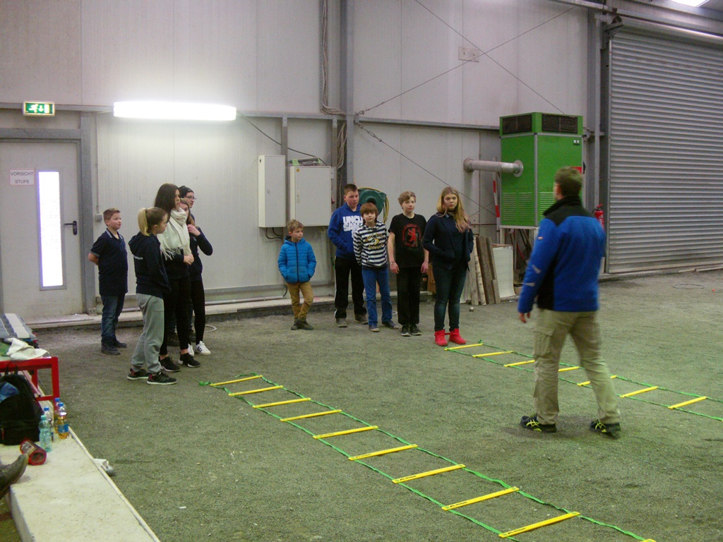 Nach der Begrüßung steht erst einmal das Aufwärmen aller Muskeln, die für einen guten Bewegungsablauf beim Werfen der Kugel nötig sind, auf dem Programm! Spaß und Wachwerden inklusive! Anschließend zeigten die Teilnehmer – 13 Jugendliche jeden Alters aus NRW und 12 Jugendliche aus NiSa – in einem ersten Trainingsspiel "was sie so drauf haben“.