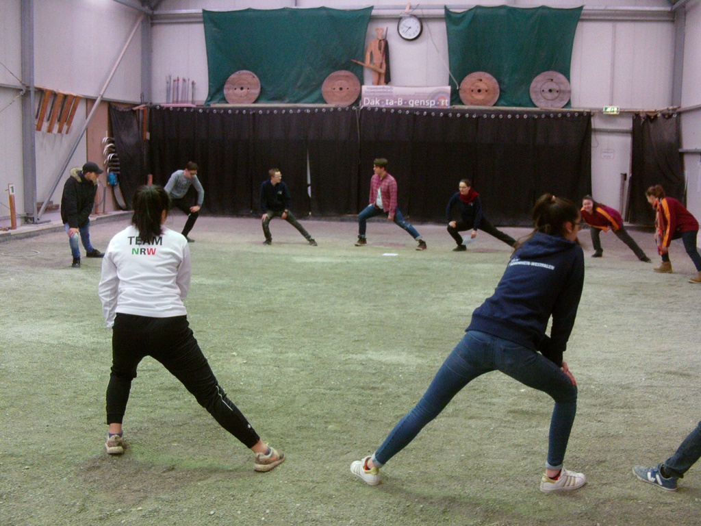Nach der Begrüßung steht erst einmal das Aufwärmen aller Muskeln, die für einen guten Bewegungsablauf beim Werfen der Kugel nötig sind, auf dem Programm! Spaß und Wachwerden inklusive! Anschließend zeigten die Teilnehmer – 13 Jugendliche jeden Alters aus NRW und 12 Jugendliche aus NiSa – in einem ersten Trainingsspiel "was sie so drauf haben“.