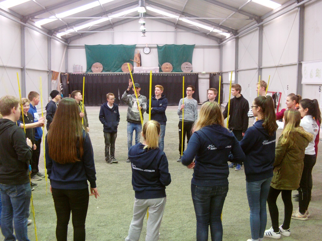 Nach der Begrüßung steht erst einmal das Aufwärmen aller Muskeln, die für einen guten Bewegungsablauf beim Werfen der Kugel nötig sind, auf dem Programm! Spaß und Wachwerden inklusive! Anschließend zeigten die Teilnehmer – 13 Jugendliche jeden Alters aus NRW und 12 Jugendliche aus NiSa – in einem ersten Trainingsspiel "was sie so drauf haben“.