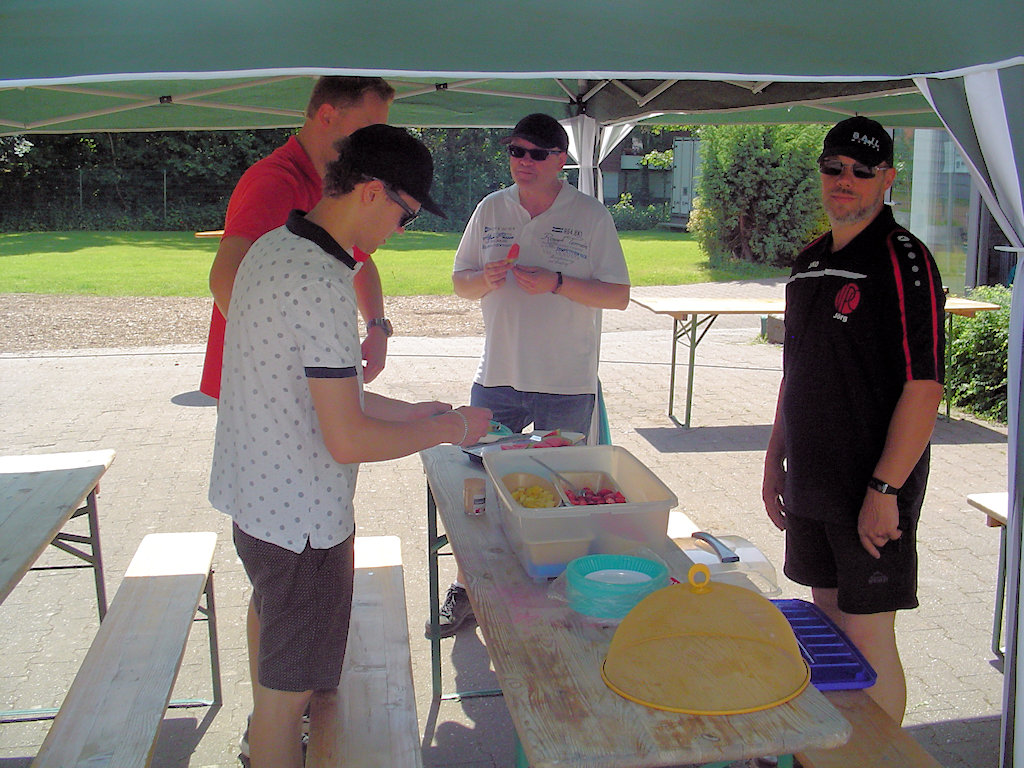 Gespielt wurde natürlich auch, hier ist noch kurz zu erwähnen das auch bei heißen Temperaturen und einem Generationenturnier festes Schuhwerk getragen werden muss. Hier besorgte unser Gastgeber ganz unproblematisch ein Schuhwerk Größe 47 für den Sandalenträger, so dass die Sicherheit wieder hergestellt war.