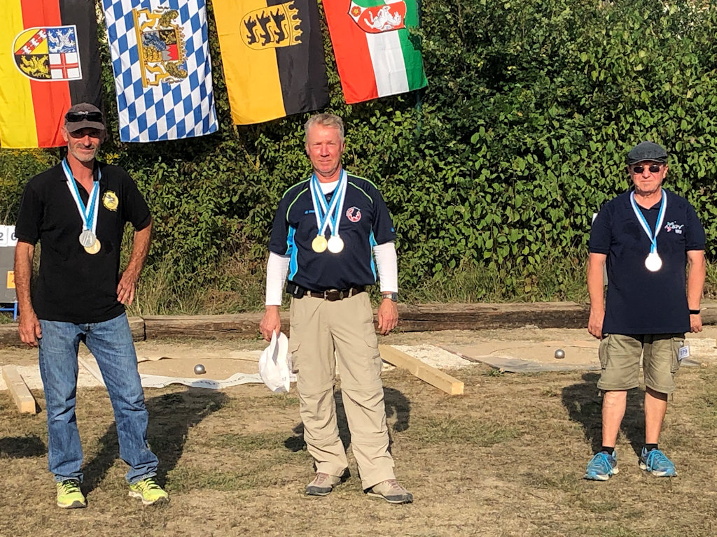 Im Rahmen der Fête de la Pétanque, die der DPV zurzeit in Fürth veranstaltet, fand am vergangenen Wochenende der Deutschland Cup der Altersklasse 55plus statt. Leider waren nur sieben (von zehn) Landesverbänden dabei, so dass es im Modus „Jeder gegen Jeden“ nur sechs Begegnungen und ein Freilos pro LV gab.