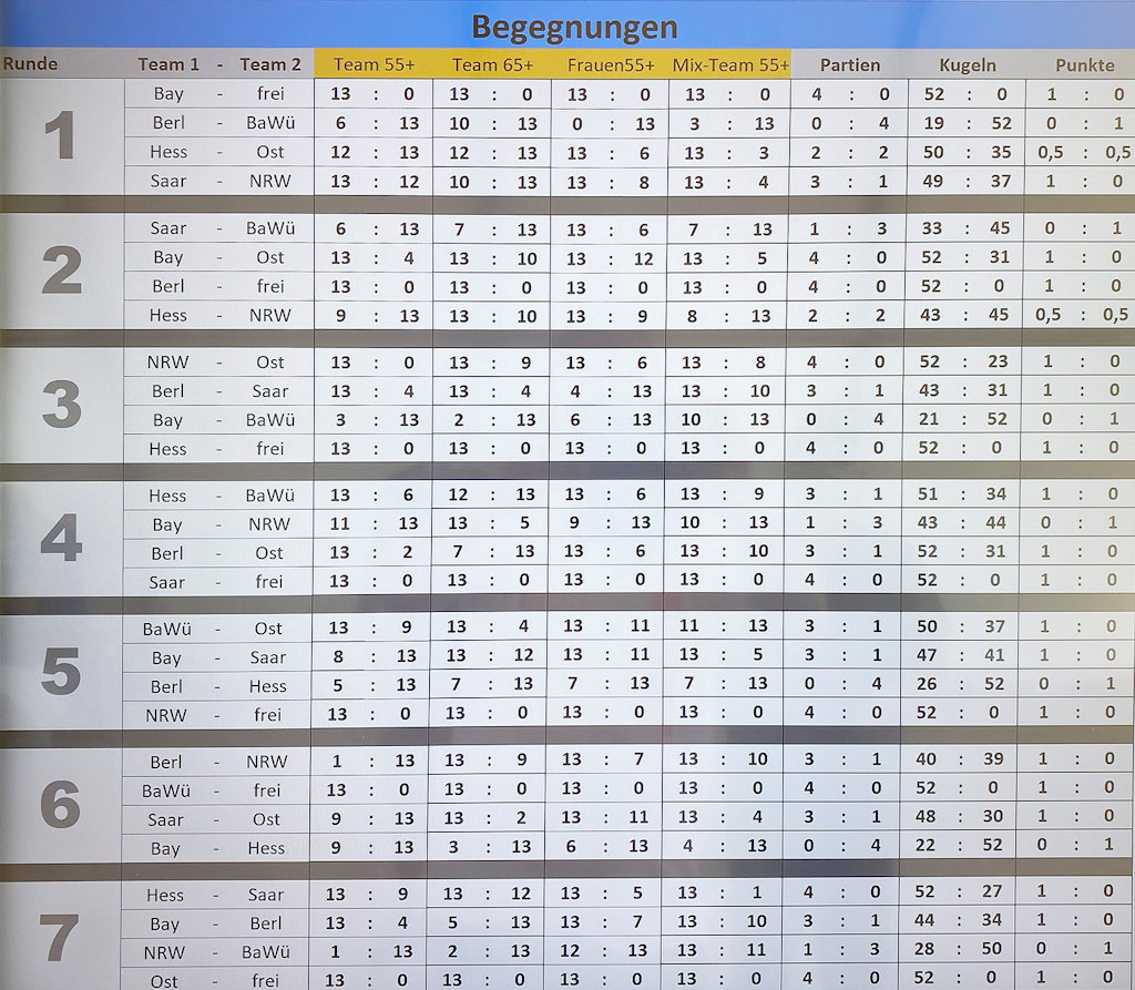 Wünschenswert (und sicherlich ohne großen Aufwand machbar) wäre eine gleichmäßigere Verteilung bei der Zuteilung der Spielfelder sowie eine feste Zuordnung der Bahnen durch die Turnierleitung gewesen. Bei uns haben mehrere Teams drei von sechs Partien auf derselben Bahn gespielt…