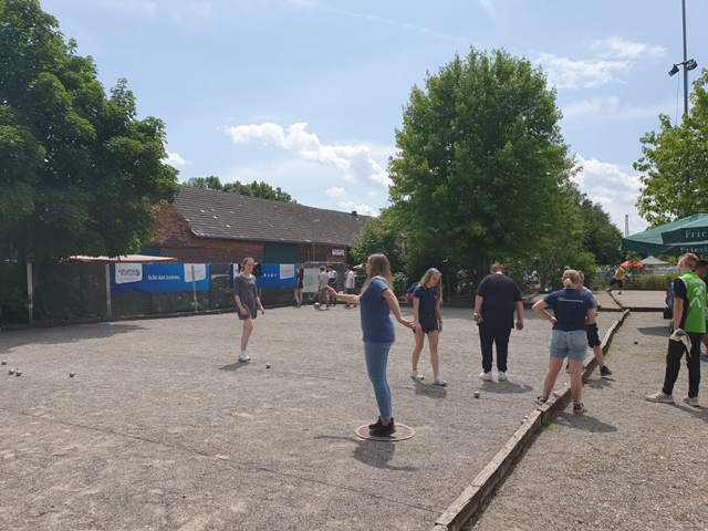 Zu Beginn hat Rudi Geiger ein kleines Aufwärmtraining mit allen Jugendlichen gemacht. Danach hat sich jeder eine Kugel geschnappt und es wurde ausgespielt wer mit wem spielt, dann wurden zwei entspannte Runden gespielt, wobei alle viel Spaß hatten. Aber es wurde nicht nur Boule gespielt, sondern man konnte auch Federball oder Tic Tac Toe spielen. Die vier Neulinge Anna Pirwitz, Barbara Hasenberg, Luca Weßdbaum und Emil Schüring wurden von allen sehr gut eingebunden und alle haben sich gut verstanden.