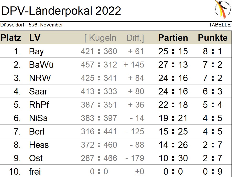 Am 05./06. November fand der Länderpokal 2022 in der Düsseldorfer Boulehalle statt. Neun Landesverbände waren angereist, um die besten Platzierungen auszuspielen. Die von Landescoach Berthold Ulrich nominierte Equipe sowie die von Hans-Christian Paffrath ausgesuchten Jugendspieler hatten sich vorgenommen, den Heimvorteil auszunutzen.