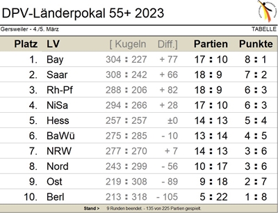 Leider ging es nicht so weiter. Die beiden nächsten Kontrahenten, erst Rheinland Pfalz und dann der Gastgeber aus dem Saarland, gehörten Beide zum engeren Kreis der Favoriten auf eine Medaille. Lediglich unser 55+ Team konnte sich durchsetzen, so gingen diese Vergleiche 1:2 verloren.