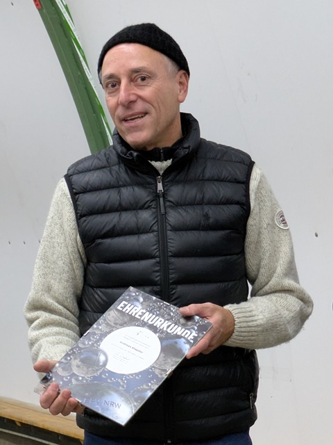 Als Präsidentin durfte ich dann gemeinsam mit Jan diejenigen anwesenden Vereinsmitglieder ehren, die von Vereinskollegen für ihren besonderen Einsatz vorgeschlagen worden waren: Andreas Fretz, Andreas Klapdor, Friedhelm Meiß, Dieter Walraffen, Ralph Beuth, Wilhelm Hachmann, Klaus Maciuga und Hubert Bäumer. Ein besonderer Dank geht hierbei an diejenigen Menschen aus den Vereinen, die ein offenes Auge für den Einsatz ihrer Mitmenschen hatten und sich für sie einsetzen. Die lieben Worte, die einige für die Auszuzeichnenden geschrieben hatten, berührten die Anwesenden zum Teil. sehr. Der Vizepräsident Schiedsrichterwesen Graziano Cecchetin bedankte sich bei seinem Vorgänger und Mentor Peter Schauseil. Guido Bergob erhielt als Letzter für seine jahrzehntelange ehrenamtliche Tätigkeit im Verband in verschiedenen Funktionen ebenso wie die anderen eine Urkunde und die Ehrennadel des BPV.